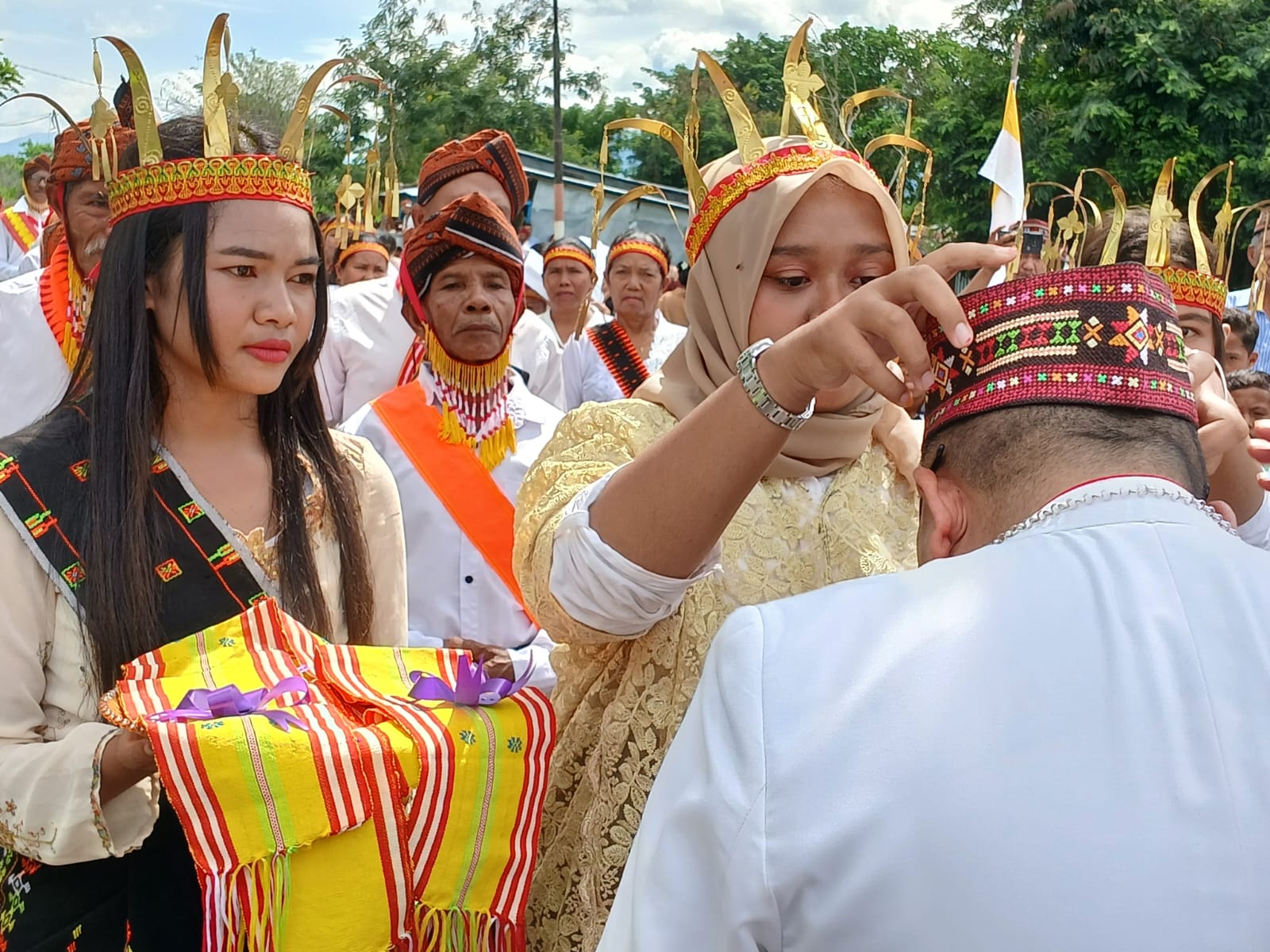 Namun yang paling mencuri perhatian adalah keterlibatan aktif umat Muslim setempat dalam seluruh rangkaian penyambutan. Tokoh agama dan warga Muslim turut berdiri di barisan penerima tamu, membantu pengamanan, serta ambil bagian dalam prosesi adat.
