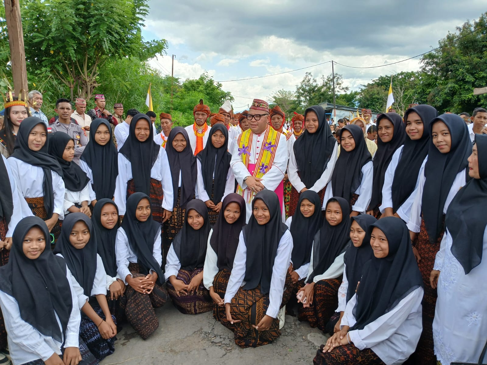 Tokoh agama dan warga Muslim turut berdiri di barisan penerima tamu, membantu pengamanan, serta ambil bagian dalam prosesi adat menyambut kunjungan Mgr Maksi ke Stasi St Markus, Nangalili, Paroki Wae Nakeng, Minggu (1/3). (sumber: Vinsen Patno)NANGALILI (Floresku.com) - Kunjungan pastoral Mgr. Maksimus Regus (Mgr Maksi), Uskup Keuskupan Labuan Bajo, ke Stasi St. Markus Nangalili, Paroki Santa Familia Wae Nakeng, Kecamatan Lembor, Minggu (1/3), berlangsung meriah dan sarat makna persaudaraan lintas iman.