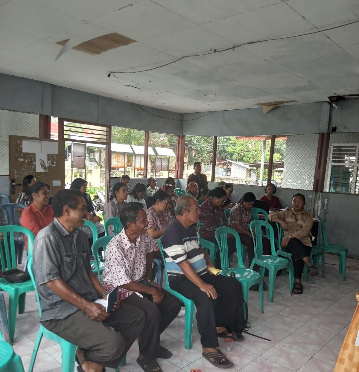Ruang pertemuan yang sempit dan bocor memaksa peserta berpindah tempat, bahkan peralatan seperti komputer dan proyektor ikut dipindahkan demi menghindari kerusakan.