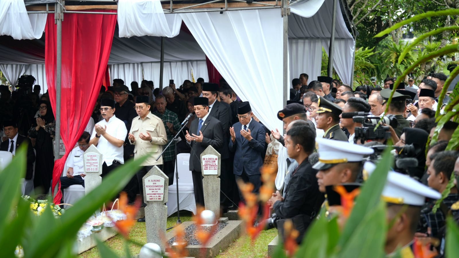 Upacara tersebut dihadiri Presiden Prabowo Subianto, Wakil Presiden Gibran Rakabuming Raka, serta jajaran menteri dan pimpinan lembaga Kabinet Merah Putih. Kehadiran para pemimpin negara menjadi simbol penghargaan atas jasa besar almarhum dalam perjalanan bangsa.